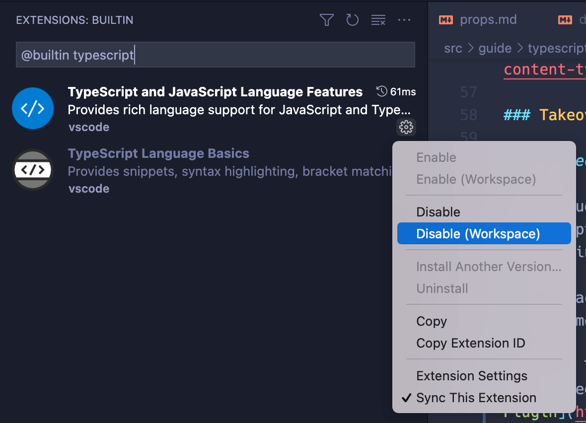 typescript(不要删除@builtin前缀)。 - 点击“TypeScript and JavaScript Language Features”右下角的小齿轮,然后选择“Disable (Workspace)”。